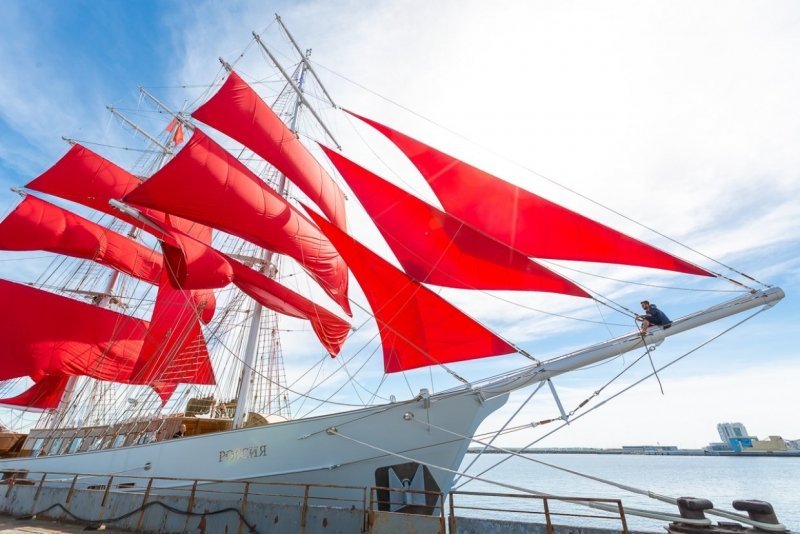 Главным героем «Алых парусов — 2019» на этот раз станет отечественный бриг «Россия». Корабль выйдет в акваторию Невы под российским флагом и с российский экипажем. Паруса для него создали из 900 квадратных метров алой ткани.