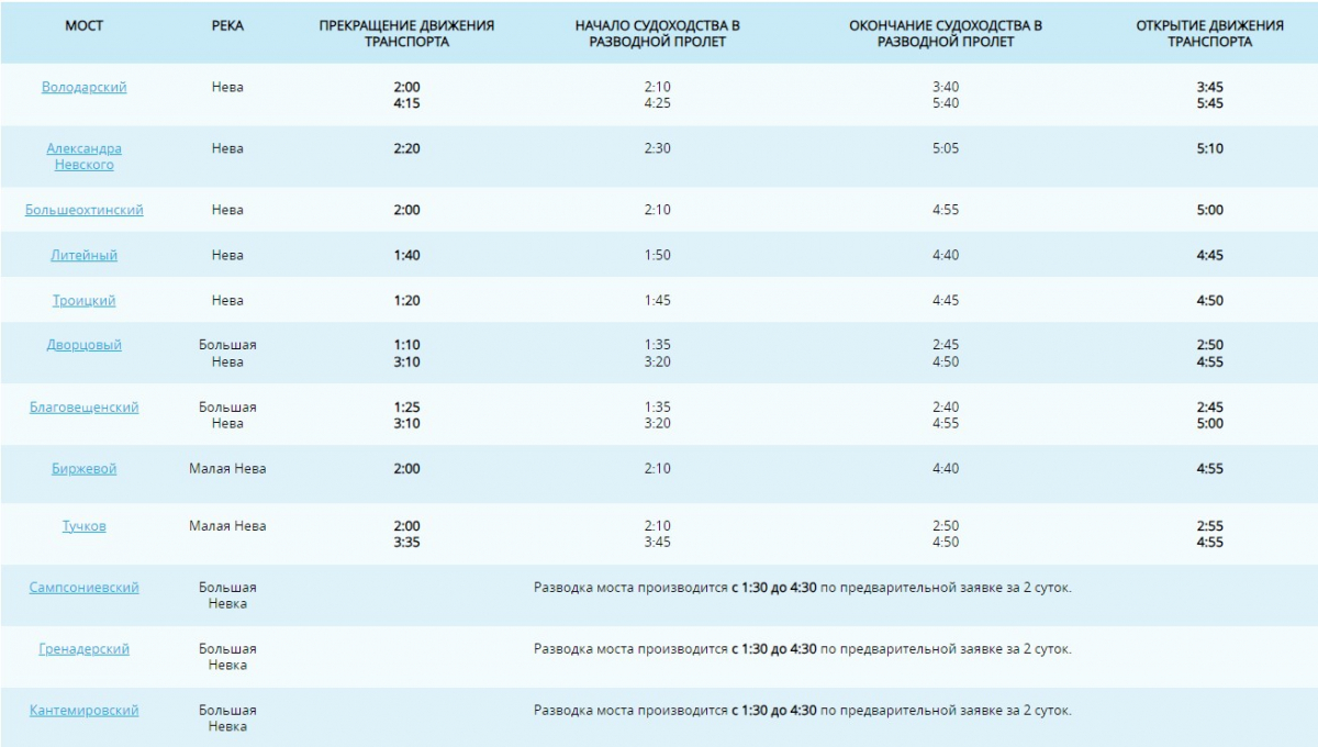 Мосты разводят каждую ночь с апреля по конец ноября. График разводки лучше уточнять заранее, он может меняться в связи с праздниками, когда по Неве торжественно проходят суда (День Военно-Морского флота, День Речного флота, «Алые паруса»), и даже климатическими условиями. Примечательно, что если столбик термометра зашкаливает за отметку +25 или ветер разгулялся не на шутку (набрал скорость более 15 метров в секунду), разводка мостов приостанавливается.