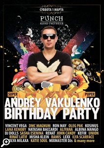 Из года в год в начале марта известный петербургский диджей и музыкант Andrey Vakulenko собирает друзей и поклонников для того, чтобы с размахом отпраздновать свой День рождения. За всю свою творческую карьеру Andrey Vakulenko выпустил огромное число релизов в разных направлениях house-музыки, он регулярно входит в десятку лучших диджеев страны и выступает на ведущих площадках не только в России, но и за рубежом. 1 марта в популярном клубе Punch соберутся именитые друзья артиста — известные промоутеры, продюсеры, музыканты и, конечно, диджеи, которые выйдут на сцену, чтобы поздравить именинника. Атмосфера праздника и настоящее музыкальное наслаждение ждет вас 1 марта на Andrey Vakulenko Birthday Party в клубе Punch!