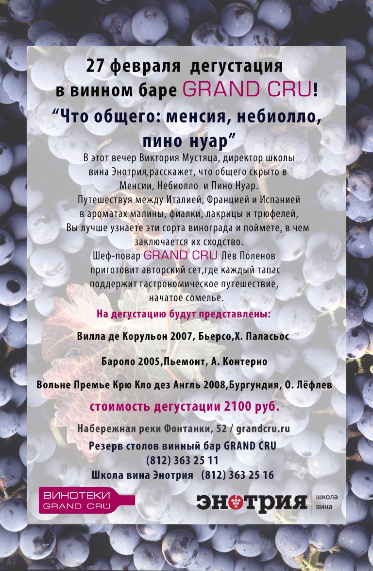 В этот вечер Виктория Мустяца, директор школы вина Энотрия расскажет, что общего скрыто в Менсии, Небиолло и Пино Нуар.