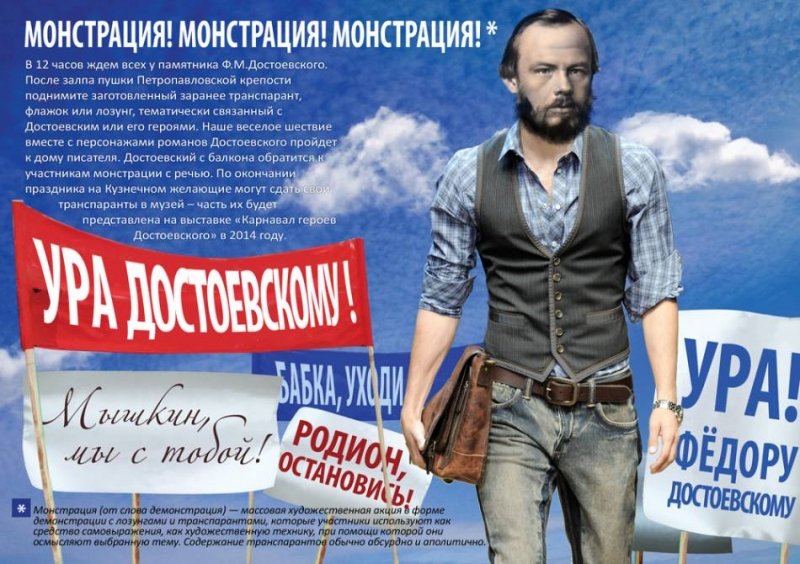 У памятника Ф.М.Достоевскому на Большой Московской, 1 в полдень начнется удивительное действо – Монстрация. Безумные наряды, дурацкие фантасмагорические лозунги и отличное настроение – главные составляющие этого парада. Полноценно участвовать в Монстрации может каждый желающий: это прекрасная возможность оценить творчество любимого автора в новом контексте.