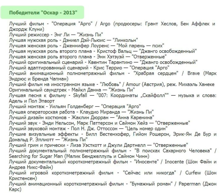 24 февраля 2013 года в Лос-Анджелесе состоится 85-я церемония вручения наград американской киноакадемии «Оскар». Вести вечер будет Сет Макфарлейн. В ночь с 24 на 25 января в 4:00 утра вы сможете увидеть прямую трансляцию по Первому каналу.