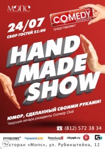 Летний сезон в Ресторане «МОПС» начинается с нового эксклюзивного юмористического шоу от резидентов Comedy Club. Hand made show – особый душевный юмор, созданный на основе взаимной симпатии зрителя и артиста.