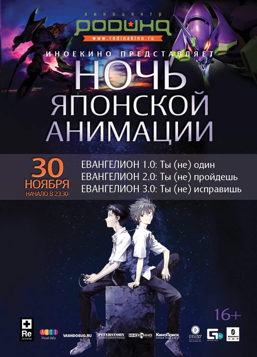 «Иноекино» представляет долгожданную ночь, посвященную японской анимации. Пройдет она в самом центре города в киноцентре «Родина». В этот раз зрители смогут посмотреть три фильма культовой фантастической саги «Евангелион», созданные на основе знаменитого сериала. Причем третья часть " Евангелион 3.0: Ты (Не) исправишь» пройдет в рамках премьеры и будет демонстрироваться на большом экране впервые в России.