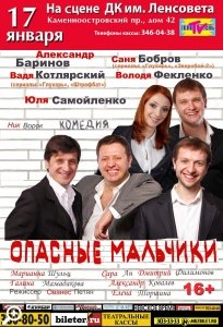 Может показаться, что бесспорный успех спектакля обусловлен участием этой звездной команды. Тем не менее, в «Опасных мальчиках» каждый из артистов предстает перед зрителем в абсолютно новом качестве. Ни один из них не похож на свой «сериальный образ», чему сами актеры откровенно рады. «Мы совершенно другие, мы непривычные, и это наше огромное актерское счастье», — так говорят о своих ролях в спектакле коллеги по сцене. Экспрессивный, местами трогательный Александр Бобров, легкий в движениях, на удивление пластичный Владислав Котлярский, гомерически смешной и нелепый Владимир Фекленко, играющие трех братьев, являют собой великолепно слаженный актерский ансамбль, который заражает своей энергией и оптимизмом!
