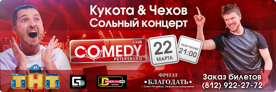 Совсем скоро на борту всеми любимого фрегата «Благодать» состоится сольный концерт искромётного дуэта «Игоря Чехова и Михаила Кукоты». Два харизматичных парня выступят на сцене Comedy Petersburg 22 марта — двойной заряд юмора и, как результат, двойное удовольствие! Дату мероприятия будет сложно забыть.