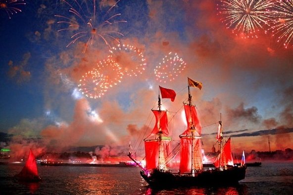Традиционное свето-пиротехническое шоу начнется с появления в акватории Невы корабля с красными парусами. Шведское судно Tre Kronor (Крунор/Три короны) уже прибыло в Петербург для соотвествующей миссии. Его выход в ночь с 20 на 21 июня будет сопровождаться выступлением большого эстрадно-симфонического оркестра и хора под управлением дирижера Михайловского театра Алексея Ньяги.